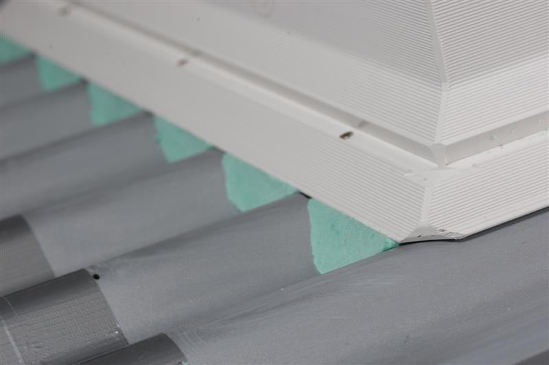 Die Abdichtungsarbeiten auf dem Welldach beginnen mit dem Setzen des Aufsetzkranzes. Hierzu werden die Befestigungslöcher gemäß der Einbauanleitung mit einem 3 mm Bohrer vorgebohrt und mit selbstschneidenden Metallschrauben auf den Erhöhungen des Welldaches befestigt. Die in den Wellentälern entstehenden Zwischenräume sind zunächst mit Weichzellenschaum auszuschäumen.
